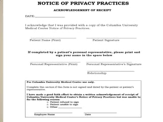 The document discusses the principles of privacy and confidentiality in clinical research, emphasizing the importance of protecting personal health information (PHI) in accordance with HIPAA regulations. It outlines the rights of patients regarding their health information, the responsibilities of healthcare providers, and the consequences of violating privacy laws. Additionally, it details procedures for handling PHI and the significance of maintaining confidentiality to build trust between participants and researchers.