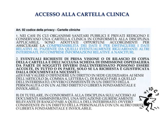 Il documento tratta delle disposizioni relative all'accesso alla cartella clinica in accordo con il codice della privacy, evidenziando la necessità di garantire la comprensibilità dei dati personali e le condizioni per la richiesta di accesso da parte di terzi. Sono indicate le modalità in cui il trattamento dei dati sensibili può avvenire senza consenso in contesti giuridici, tutelando i diritti fondamentali. Inoltre, si menzionano i diritti riguardanti i dati personali di persone decedute, a condizione che chi richiede l'accesso abbia un interesse legittimo.