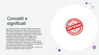 Il documento analizza i concetti di privacy e copyright, evidenziando la loro evoluzione storica e significato legale. La privacy implica il diritto alla riservatezza delle informazioni personali, mentre il copyright tutela i diritti economici e morali degli autori. Si discute inoltre dell'impatto della tecnologia e del crimine informatico sulla privacy e sul copyright nel contesto moderno.