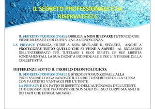 Il segreto professionale è l'obbligo di non rivelare informazioni apprese all'interno di un rapporto fiduciario e ha fondamenti etici, deontologici e giuridici. Esso protegge la riservatezza dell'utente e si differenzia dal concetto di privacy, che riguarda il rispetto dell'autonomia individuale sui dati personali. La violazione del segreto professionale e del segreto d'ufficio è punita dalla legge con pene che variano da sei mesi a un anno di reclusione.