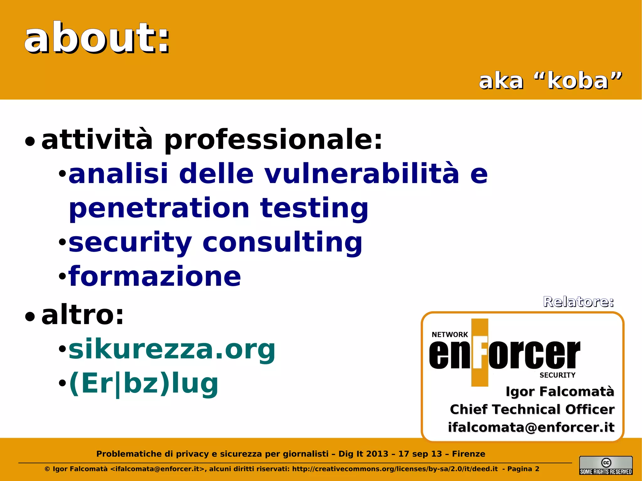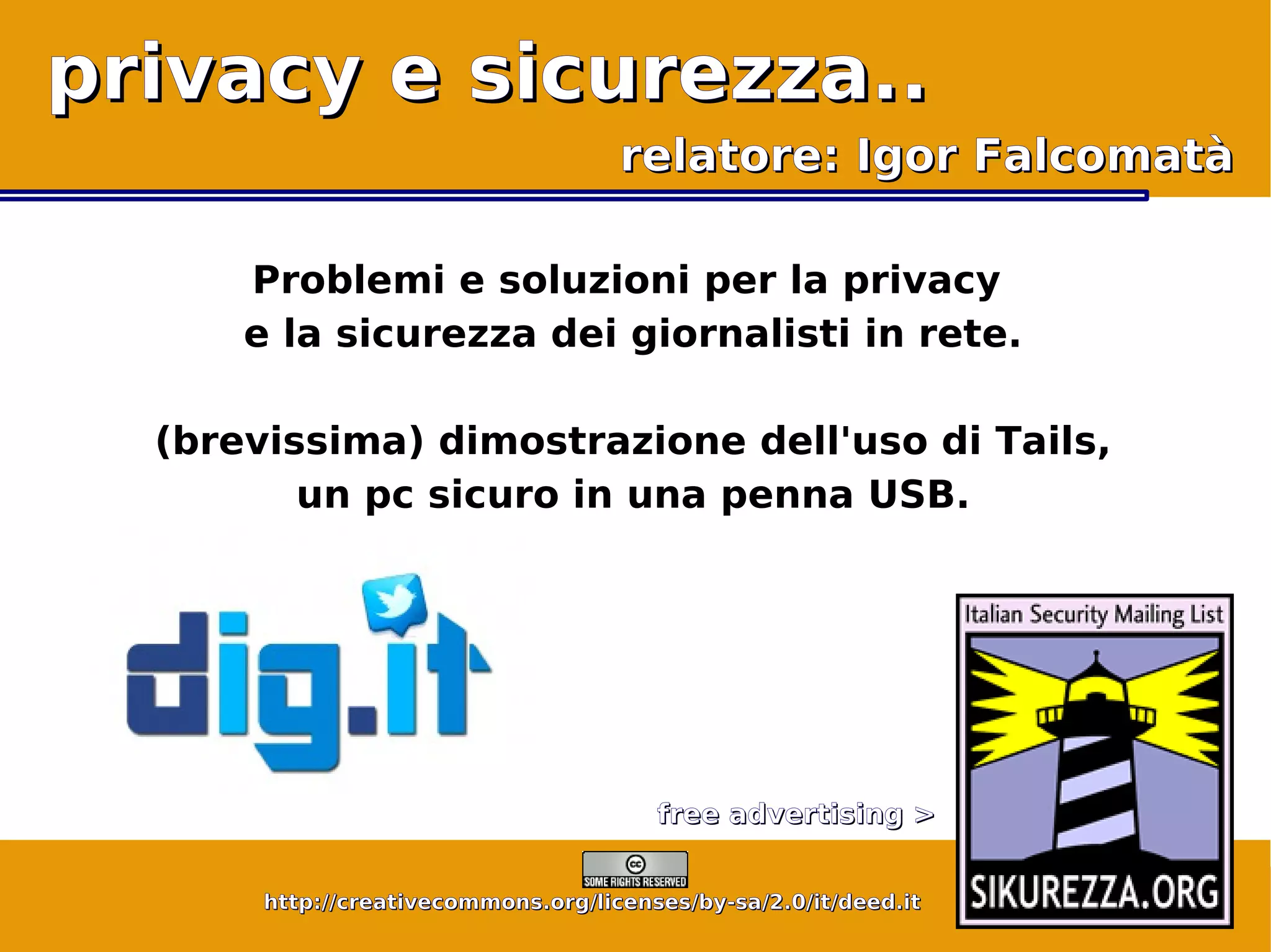 Il documento tratta delle problematiche di privacy e sicurezza per i giornalisti, evidenziando minacce come furto, perdita, ispezione e coercizione, e propone soluzioni come l'uso di Tails e la crittografia dei dati. Vengono esplorate tecniche di protezione come la cifratura del traffico e l'anonimizzazione. Inoltre, il relatore, Igor Falcomatà, condivide risorse e pratiche consigliate per mantenere la sicurezza informatica.