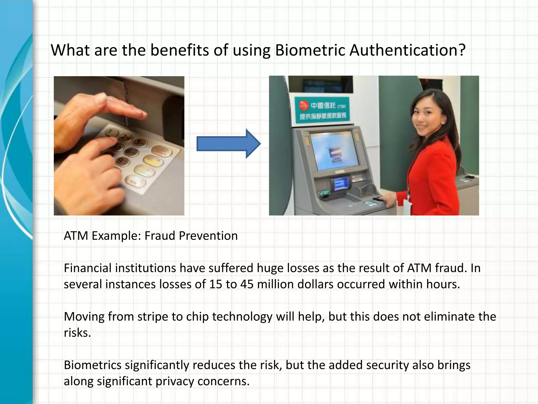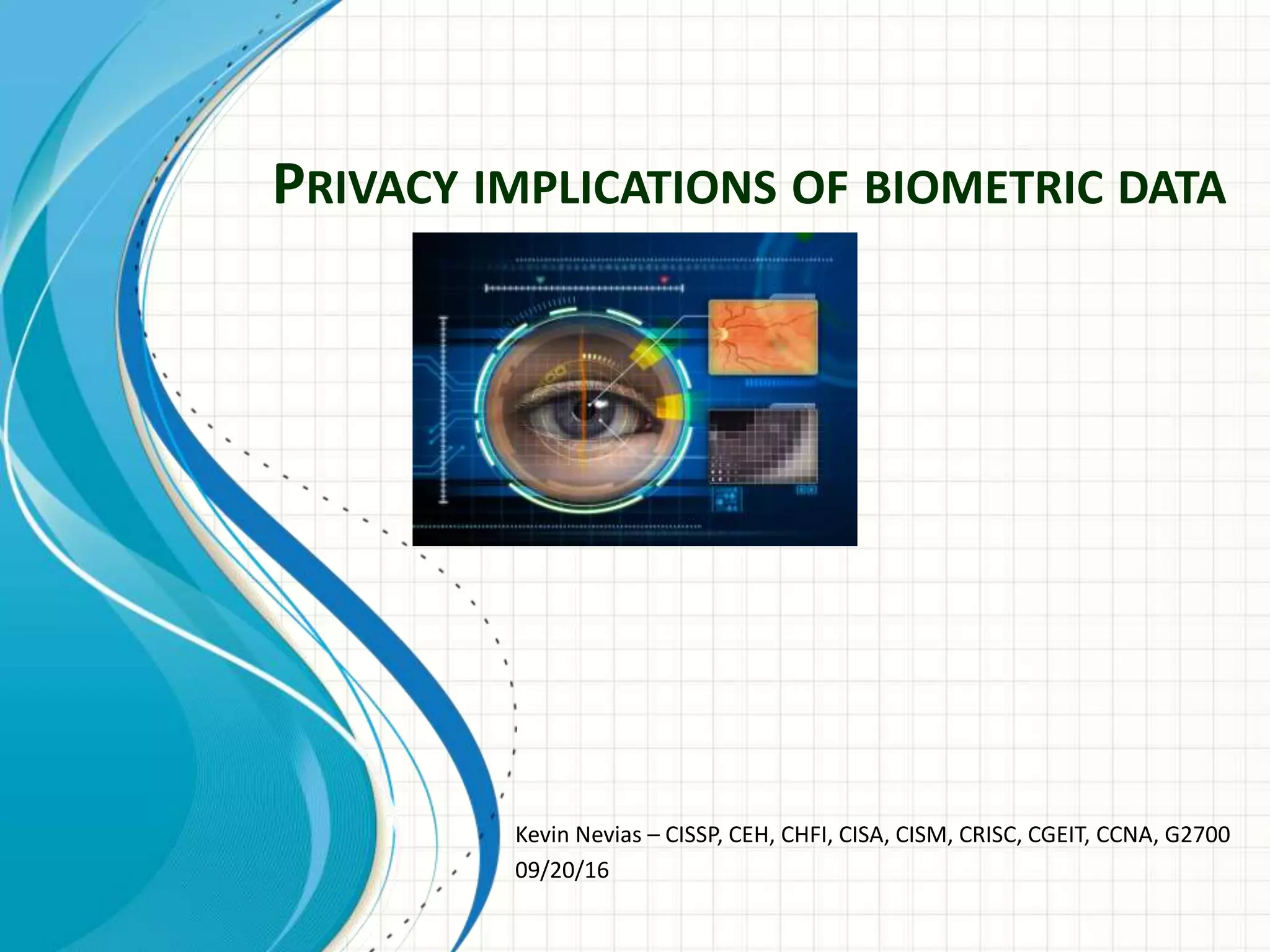 This document discusses privacy implications of biometric data. It provides examples of how biometric authentication is used for fraud prevention at ATMs and for banking in Africa. Benefits include security, safety, ease of use and speed. Biometric data can be stored on or off devices. Off-device storage raises more privacy concerns as the data is transmitted and stored by vendors. Regulations for biometric data vary globally, with the EU having stricter laws. Disclosure of biometric data like fingerprints can impact individuals even if current misuse potential is limited, due to integrity and availability risks. Social and privacy concerns must be addressed for broad biometric adoption.