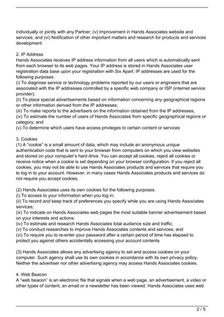 Hands Associates collects personal information from users when they use Hands Associates products and services or make registrations. This personal information includes names, contact details, credit card information, and other optional details provided by users. Hands Associates uses cookies, web beacons and scripts to track user activity on its website to improve services and for research purposes. Hands Associates shares personal information with partners to carry out advertising and promotional activities, but does not share personal information publicly without user consent, except if legally required to do so.