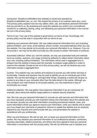 This privacy policy explains how ShopSurvivalShelters collects, stores, uses, and discloses personal information provided by users of its website. The policy outlines that personal information may be collected from users and used to provide services, communicate with users, and improve the website. Personal information will not be sold or disclosed without user authorization, except as required by law. The policy is governed by the website's terms of use and may be updated by publishing changes on the website.