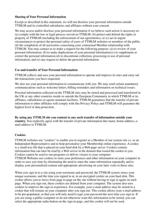 This document outlines TTMLM's privacy policy and terms of use for their websites. It discusses how personal information is collected from users including usernames, passwords, contact details, and financial information. The information is used to manage user accounts and send promotional materials. Personal information may be shared with TTMLM subsidiaries and is stored in the UK or other countries. Users consent to this by using the websites and can request access to their data. The policy also discusses how cookies are used to personalize the user experience.