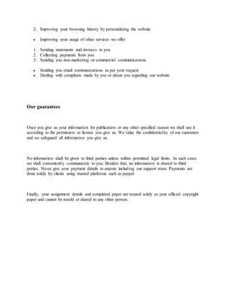The privacy policy of bestcustomwritings.com outlines the information collected from users, which includes computer and transaction details. It details how this information may be used, including website administration, improving services, and communication with clients. The policy emphasizes the confidentiality of user information and states that it will not be shared with third parties, except under legal obligations.