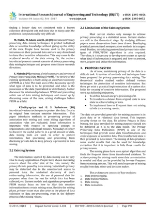 This document proposes a system to preserve privacy in data mining using an inverse frequent itemset mining approach. It discusses limitations in existing privacy preserving data mining techniques. The proposed system applies data transformation techniques like encryption before data mining. It then uses an inverse frequent itemset mining algorithm to find patterns in the transformed data that hide sensitive information. This allows sensitive information to be protected without loss of data utility for analysis. The system architecture includes modules for data preprocessing, transformation, mining using inverse frequent itemsets, and evaluation of results.