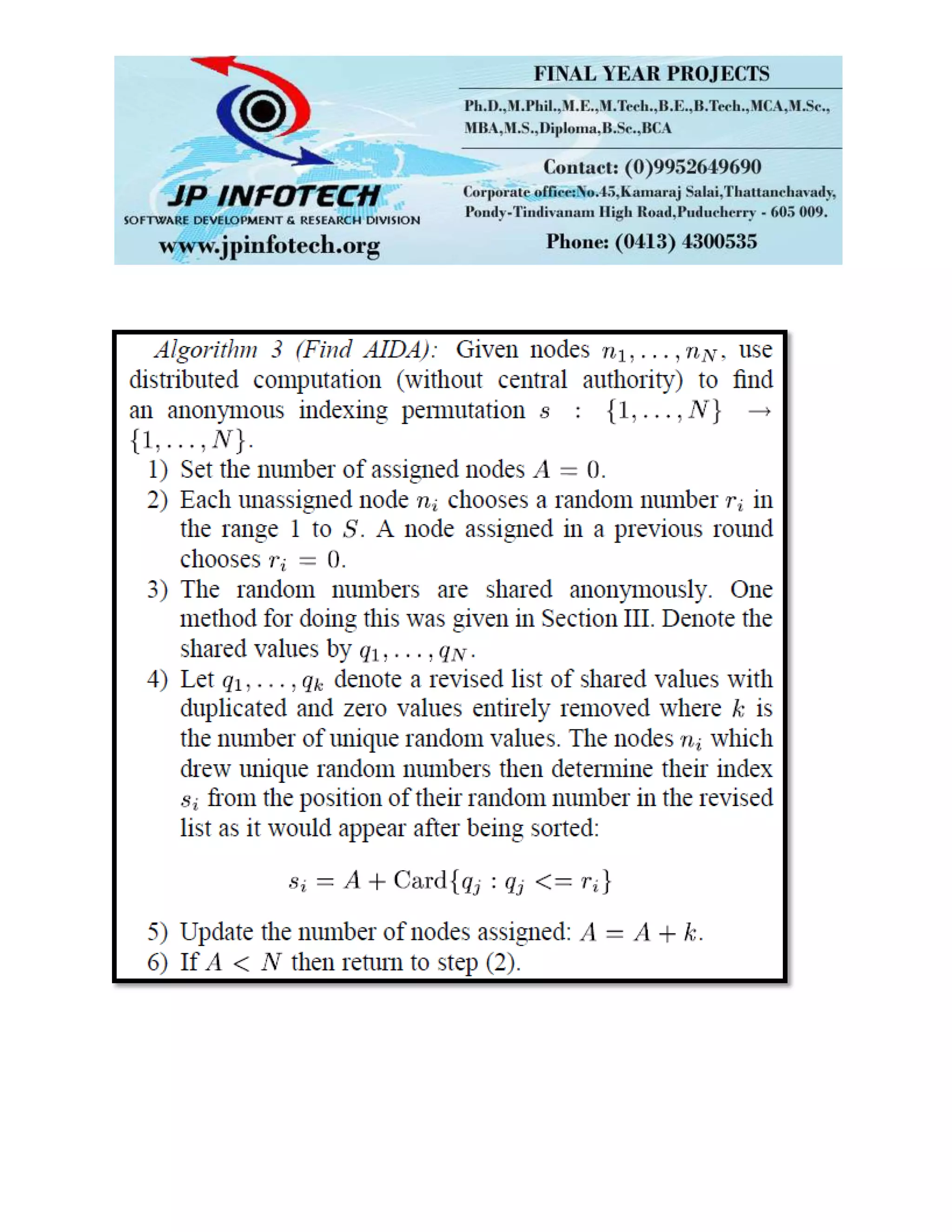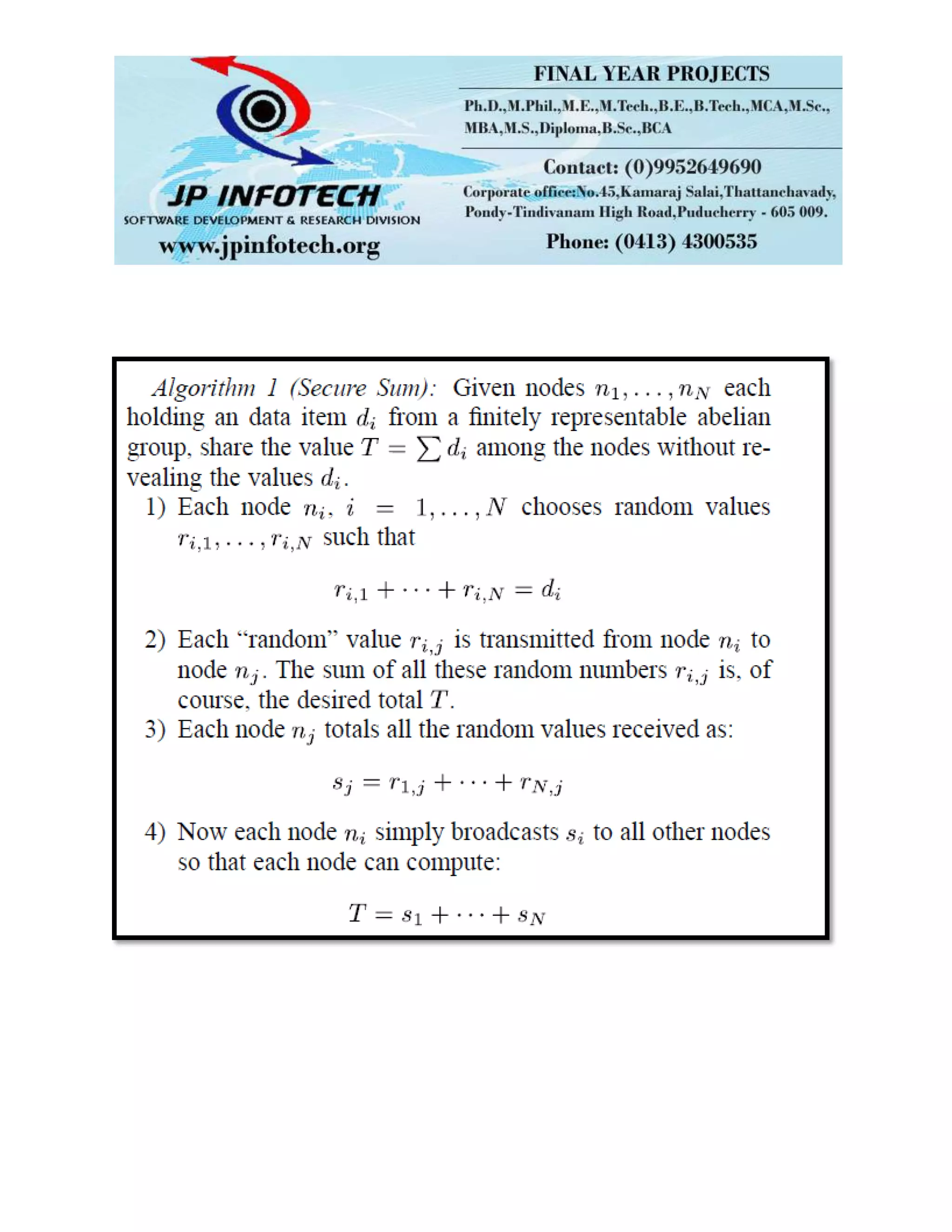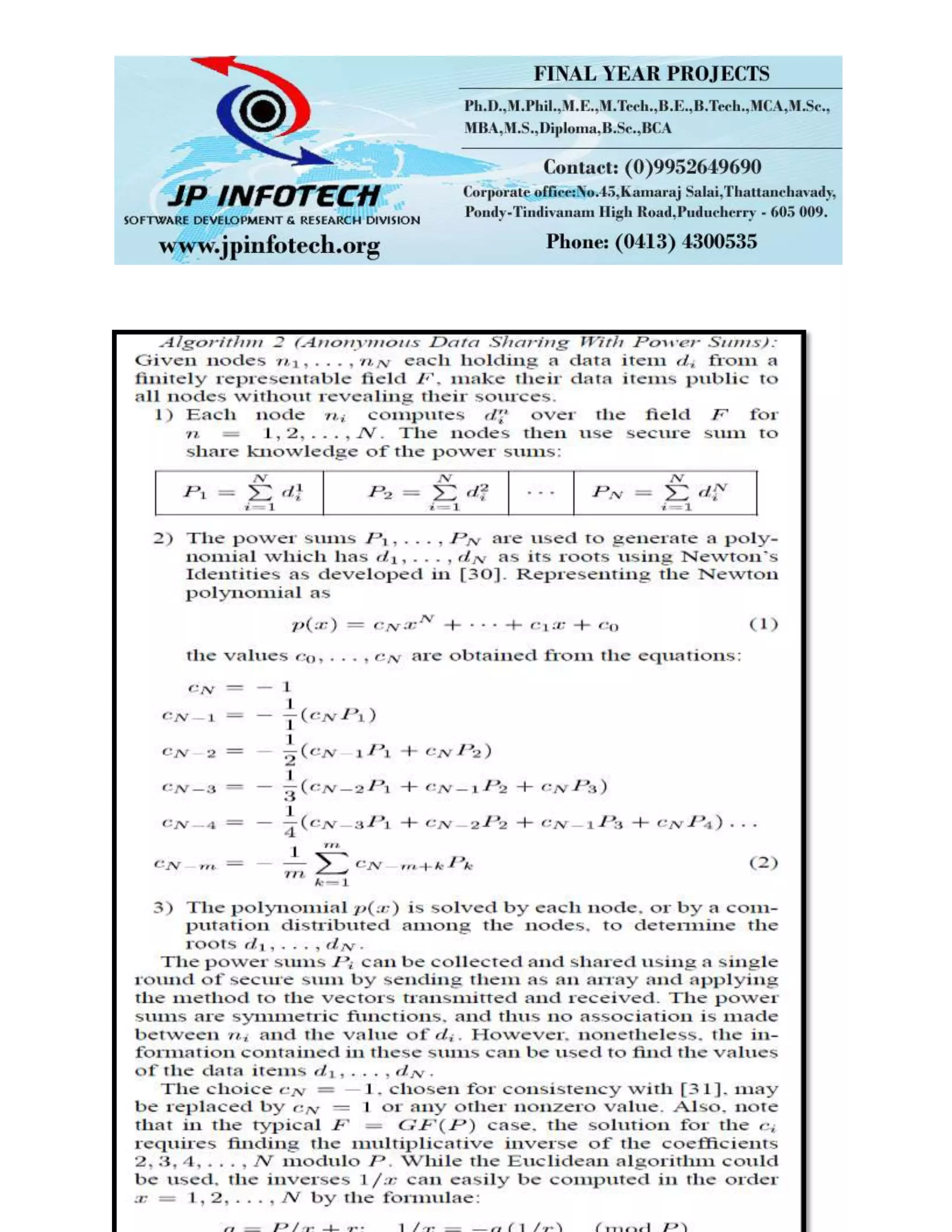 This document proposes an algorithm for anonymously sharing private data among parties without disclosing identities. It uses an iterative technique to assign node IDs from 1 to N in an anonymous manner. Existing algorithms for secure multiparty computation and anonymous ID assignment are examined. The proposed algorithm builds on secure sum operations to efficiently share simple integer data and anonymously assign IDs at each iteration. Analysis of communication and computation costs are provided for the algorithm and its variants.