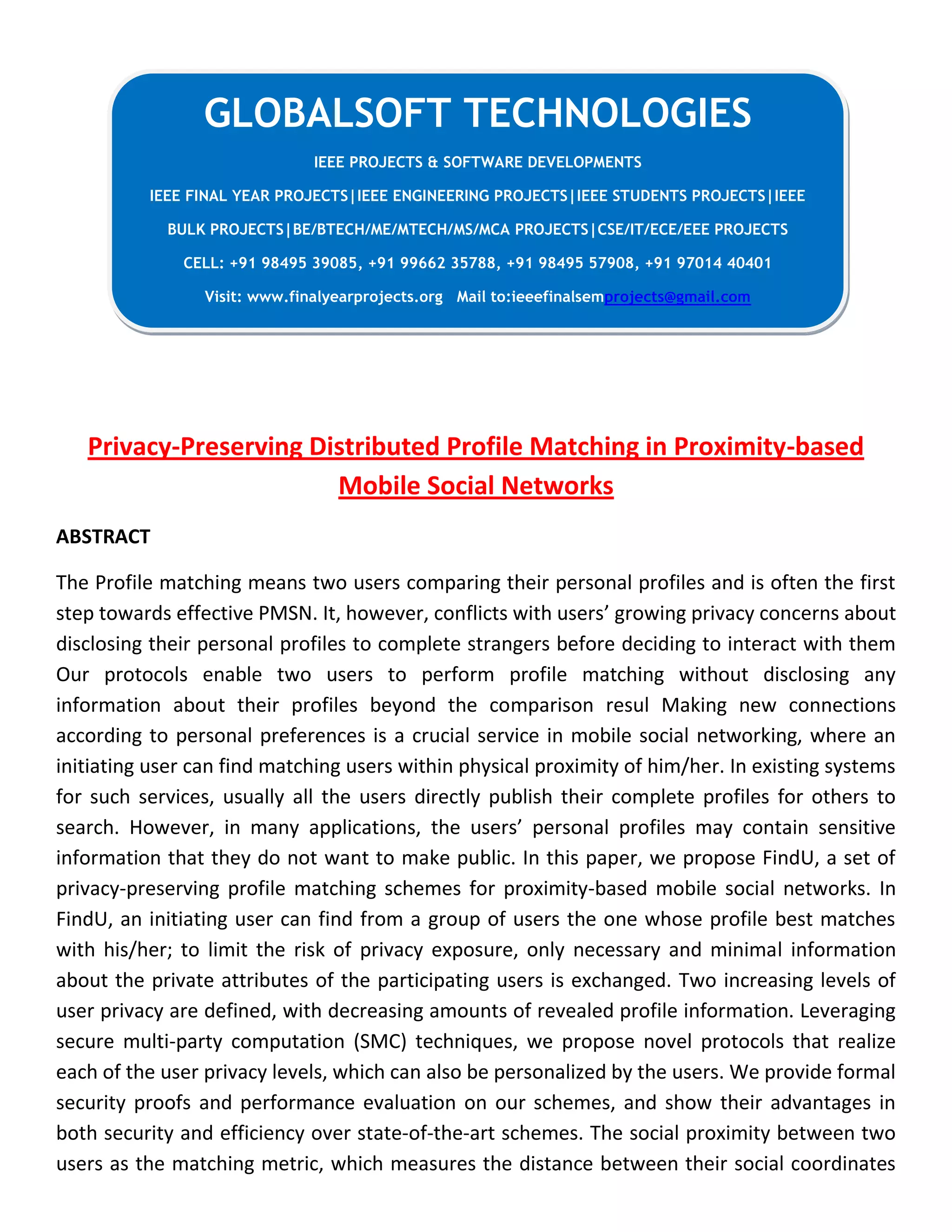 The document presents 'findu', a set of privacy-preserving profile matching schemes for proximity-based mobile social networks (PMSN), aiming to allow users to match profiles without disclosing sensitive information. It defines two levels of user privacy and utilizes secure multi-party computation techniques to enhance security and efficiency over existing systems. The proposed protocols achieve a balance between effective user discovery and protection against privacy threats, demonstrating significant performance improvements through extensive security analysis and simulations.