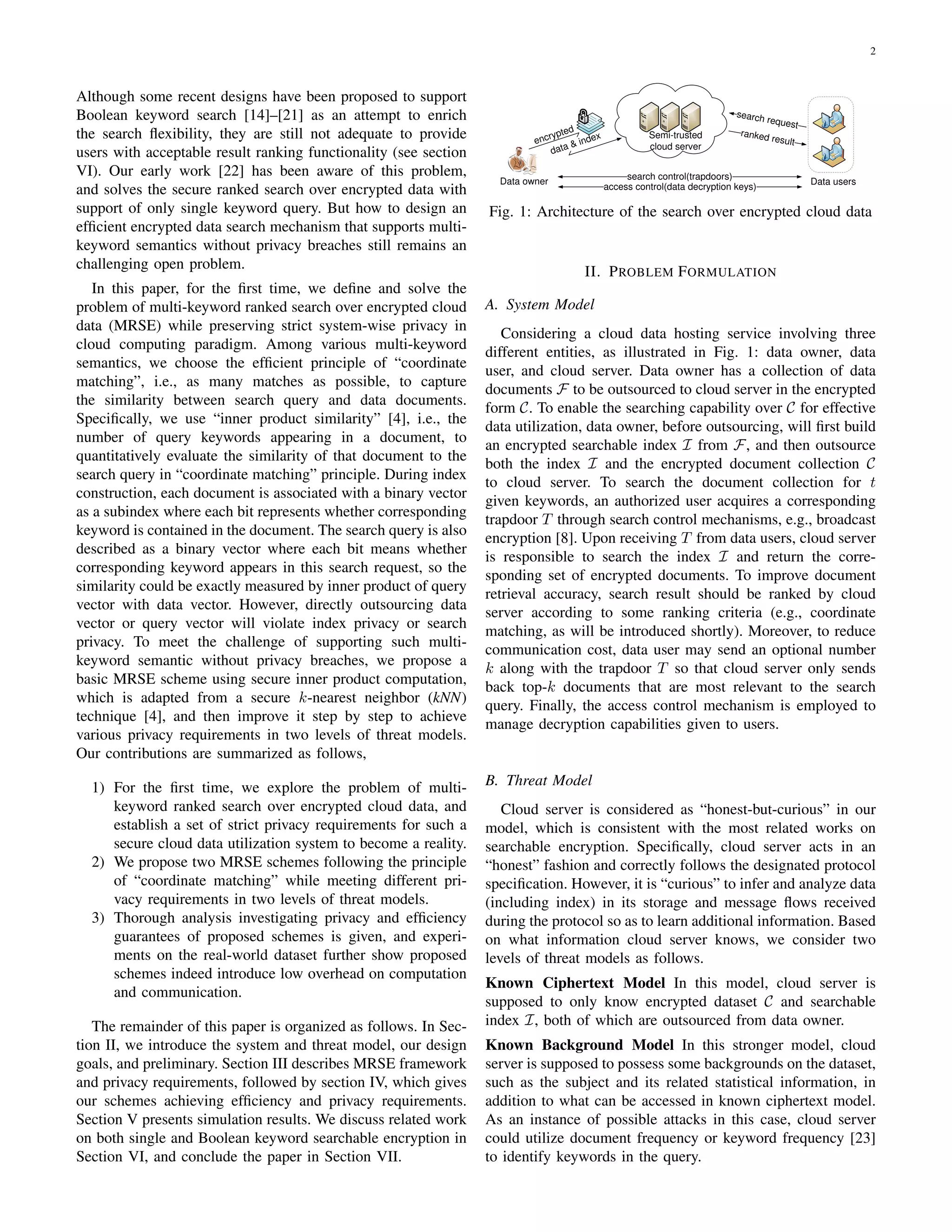 This document proposes and defines the problem of privacy-preserving multi-keyword ranked search over encrypted cloud data (MRSE). It establishes strict privacy requirements for such a system, including data privacy, index privacy, keyword privacy and trapdoor privacy. It presents the MRSE framework with four algorithms: Setup, BuildIndex, Trapdoor and Query. The Query algorithm allows cloud servers to perform a ranked search on encrypted indexes and return similarity-ranked results, while preserving privacy.