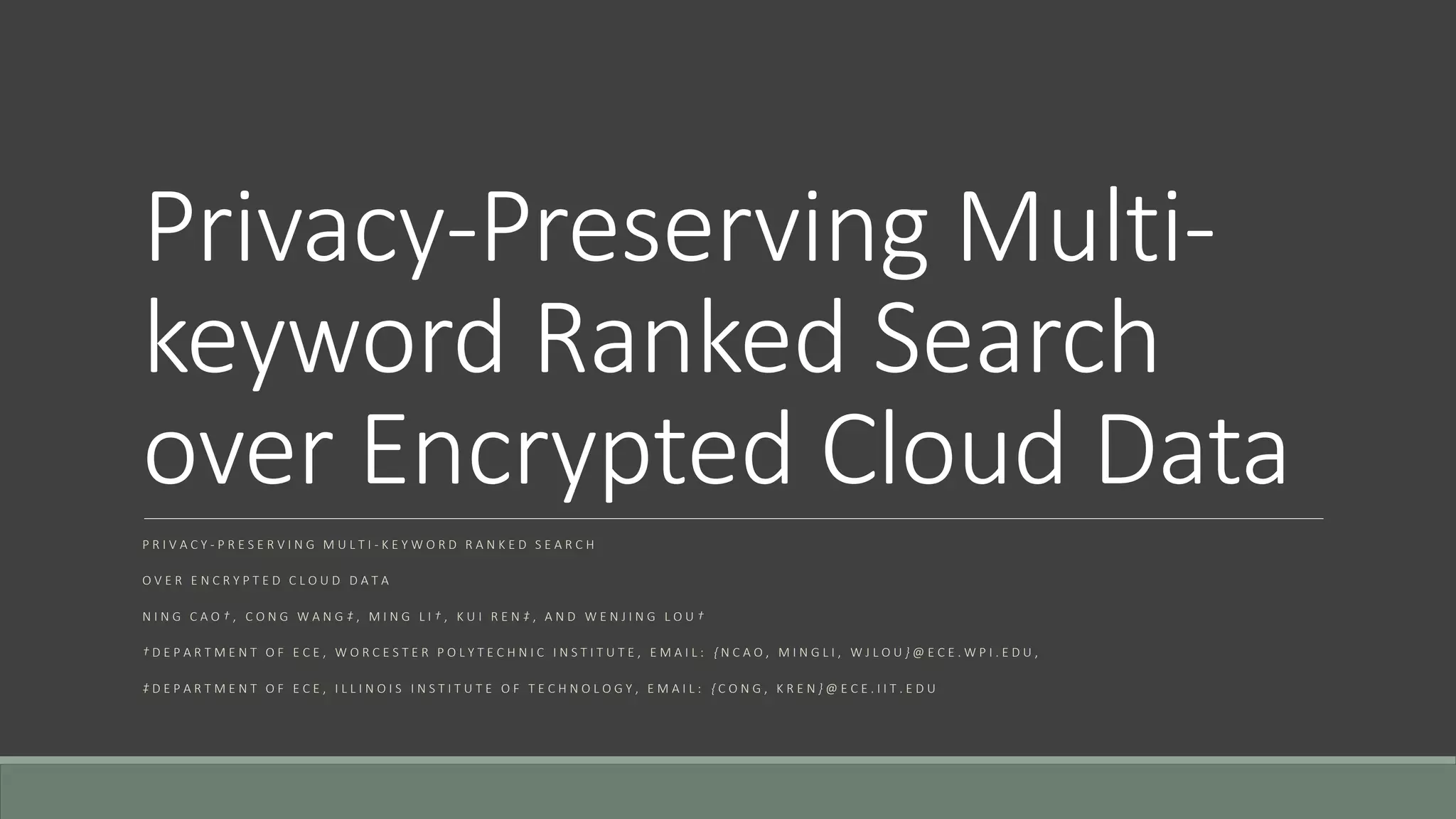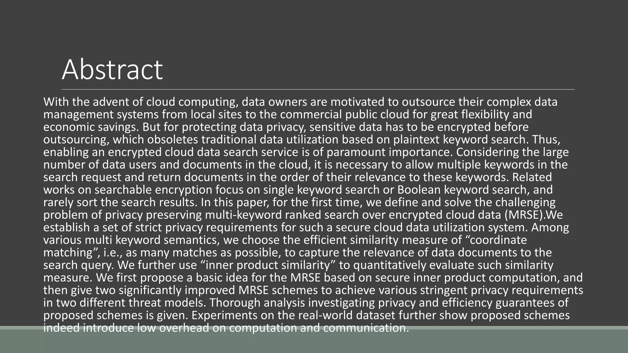 The document discusses a privacy-preserving multi-keyword ranked search (MRSE) system for encrypted cloud data, addressing the limitations of existing searchable encryption methods that typically focus on single or Boolean keyword searches. It establishes strict privacy requirements and introduces a new relevance measure called 'coordinate matching' to evaluate search results. The proposed system architecture includes modules for user registration, file upload with encryption, ranked searching, and secure downloads, demonstrating low computational and communication overhead.