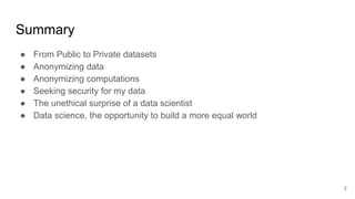 This document discusses privacy, security, and ethics in data science. It covers topics such as anonymizing data and computations, seeking security for personal data, and the unethical surprises that can occur in data science work. It also discusses how to respect privacy by securely storing data, adding layers of protection like encryption, and using techniques like distributed computing and differential privacy to better protect sensitive information. The document cautions that biases in data can propagate biases in models, and highlights the importance of addressing issues like social bias, redaction of sensitive info, and debiasing models to help ensure ethical practices in this field.