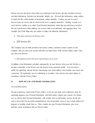 This privacy policy outlines how CS166 Blog collects and uses personal and non-personal information from users. It states that the only personal information collected is users' email addresses when they register for an account. Non-personal information such as cookies is also collected to track anonymous usage data. The policy also describes how user information is protected, how users can update or delete their information, and provides a contact email for questions.