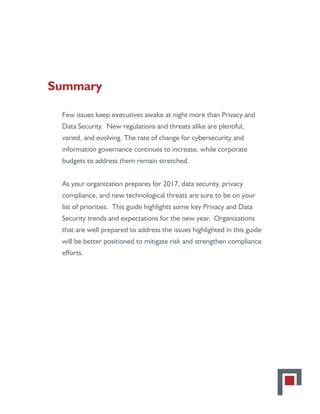This document provides a preview of key privacy and data security trends and issues that organizations should prepare for in 2017. It highlights major developments and challenges, such as the implementation of the EU's General Data Protection Regulation (GDPR), uncertainty around the EU-US Privacy Shield agreement, growing momentum to regulate privacy in internet-connected devices, and increasing privacy litigation and cyber threats. The document advises organizations to undertake assessments, update policies and procedures, and budget adequately to strengthen compliance and mitigate risks arising from these evolving laws, regulations and technologies.