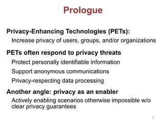This document discusses privacy-preserving techniques for information sharing and their applications. It introduces privacy-enhancing technologies that allow parties to share just the minimum required information while protecting privacy. Secure computation and private set intersection protocols are described that enable privacy-respecting data processing and information sharing when parties have limited trust. The document outlines several private set intersection techniques and their applications to privacy-preserving genomic testing and collaborative machine learning.