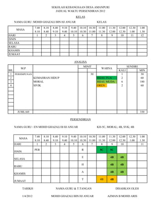 This document contains the schedule of independent study periods for teachers at Sekolah Kebangsaan Desa Amanpuri for 2012. It lists the name of teacher Mohd Ghazali bin Hj Anuar and his assignments to different classes during periods 1-12 on weekdays. It also includes an analysis of his total time spent on independent study which amounts to 330 minutes across various subjects like moral studies, civic studies and others. The schedule shows which classes he will teach independently during each time period on different days of the week.