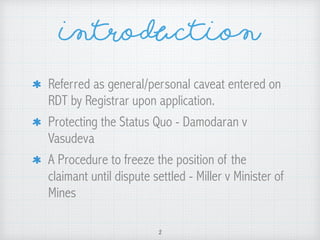 The document discusses the legal framework surrounding private caveats under land law, outlining procedures for their entry, effects, and removal as governed by specific sections of the law. It highlights the criteria for caveatable interests, the rights of claimants, and exceptions where caveats do not apply, as well as the responsibilities of the registrar. Key cases are referenced to illustrate principles and procedures applicable to private caveats in land transactions.