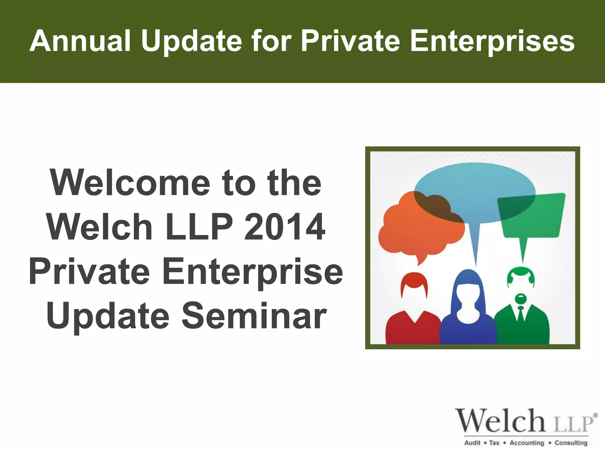 The document details the Welch LLP 2014 Private Enterprise Update Seminar, covering various accounting standards updates, including changes to ASPE and IFRS, recent developments in SR&ED, and tax strategies for private enterprises. Specific topics discussed include new and revised ASPE standards effective January 2014 and 2016, updates on IFRS standards, EDC solutions for exporters, and current corporate and personal tax rates in Canada. Additionally, the seminar included an audience Q&A and addressed the impact of federal and provincial budgets on taxation.