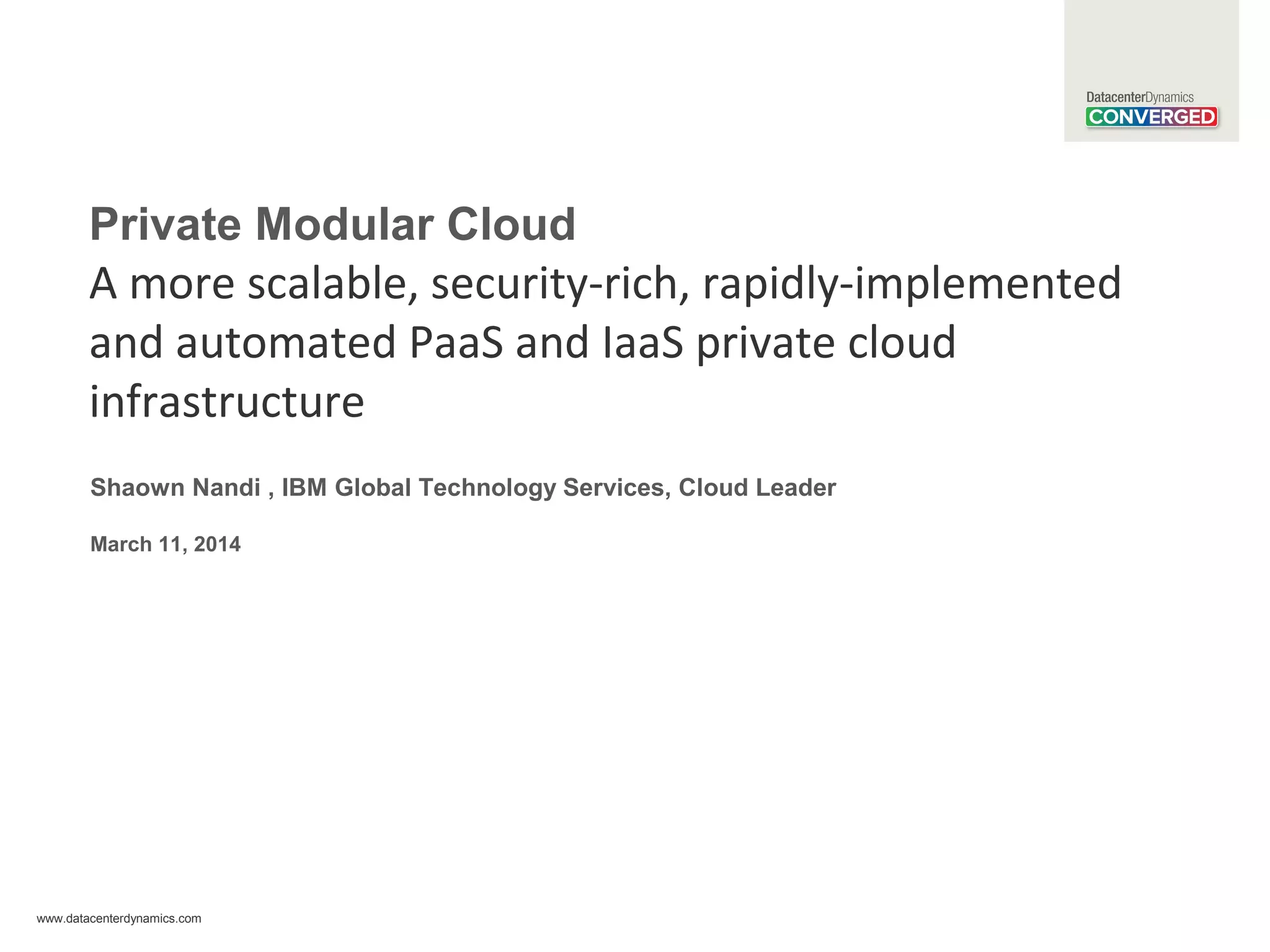 The document presents IBM's Private Modular Cloud, a customizable private cloud infrastructure designed for scalability, security, and rapid implementation. It offers modular components that allow businesses to start small and efficiently scale their cloud services, enabling quick deployment of workloads and enhanced IT productivity. Additionally, the cloud solution supports hybrid environments, integrates automation throughout deployment and lifecycle management, and addresses diverse customer needs with over 200 pre-configured application patterns.