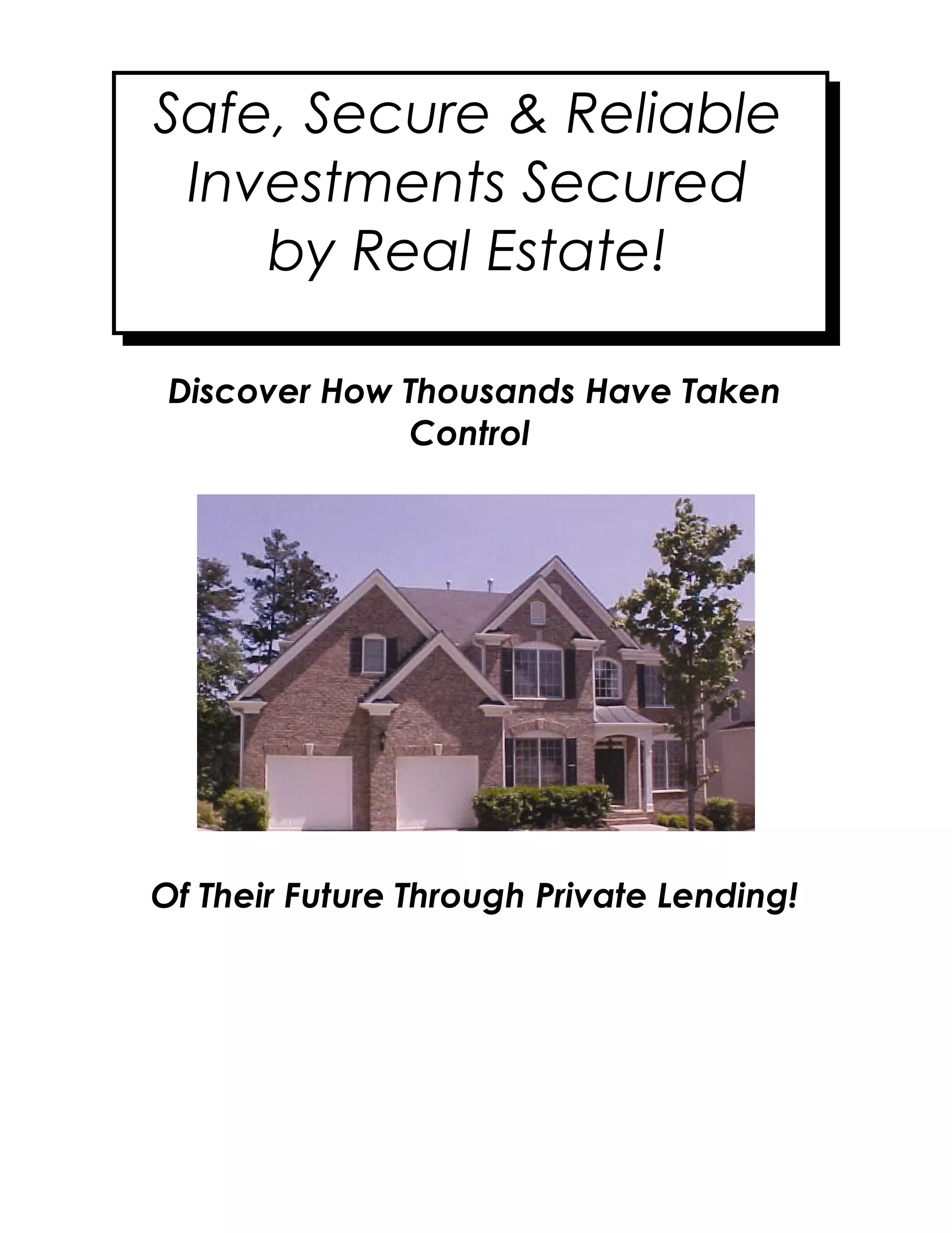 The document promotes an investment opportunity in private real estate lending. It claims investors can earn higher, secure returns compared to traditional investments. The company buys and renovates homes, then matches investors' funds to properties as collateralized loans. Investors receive documentation including promissory notes, mortgages, and insurance to secure their principal and promised returns. Examples show potential returns could be significantly higher than a 5% savings account rate. Interested investors are instructed to contact the company to discuss investment amounts and terms.