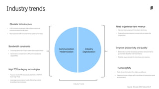 This document provides an overview of the private network market in India. It discusses trends driving demand for private networks including outdated infrastructure, bandwidth constraints of legacy systems, and the need for improved productivity and safety. It analyzes competing technologies for private networks like WiFi6, LTE and 5G. The document outlines the business case for using LTE for private networks and provides examples of private network operational models. It also segments the Indian market based on connectivity needs, categorizes ICT spending in Indian industries, and provides forecasts for the private LTE market size and share in India through 2030. Key recommendations include establishing a dedicated product team to engage with potential customers like VIL.