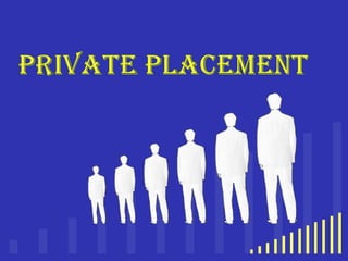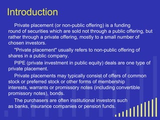 This document summarizes private placements, which are a type of private funding where securities are sold to a small number of chosen investors rather than through a public offering. It describes the types of private placements including traditional long-term loans, structured placements with stock price protections, stock options, bonds, and promissory notes. The advantages are choosing investors, less regulatory requirements than public offerings, and more flexibility. Drawbacks include difficulty raising large amounts, investors requiring lower share prices, and structured placements reducing future shares available. It also describes Qualified Institutional Placements in India which allow listed companies to issue securities privately to qualified institutional buyers through a faster process than other private placement methods.