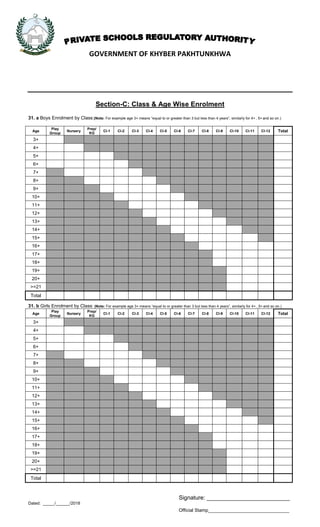 This document appears to be a registration form for private schools in Khyber Pakhtunkhwa, Pakistan. It requests information about the school such as contact details, facilities, staff, enrollment, fees, security measures, and hazards. The form has multiple sections requesting details about the physical facilities, class/age enrollment breakdown, staff, student dues/funds, security measures, and hazards. It also includes draft affidavits and declarations to be signed and stamped.
