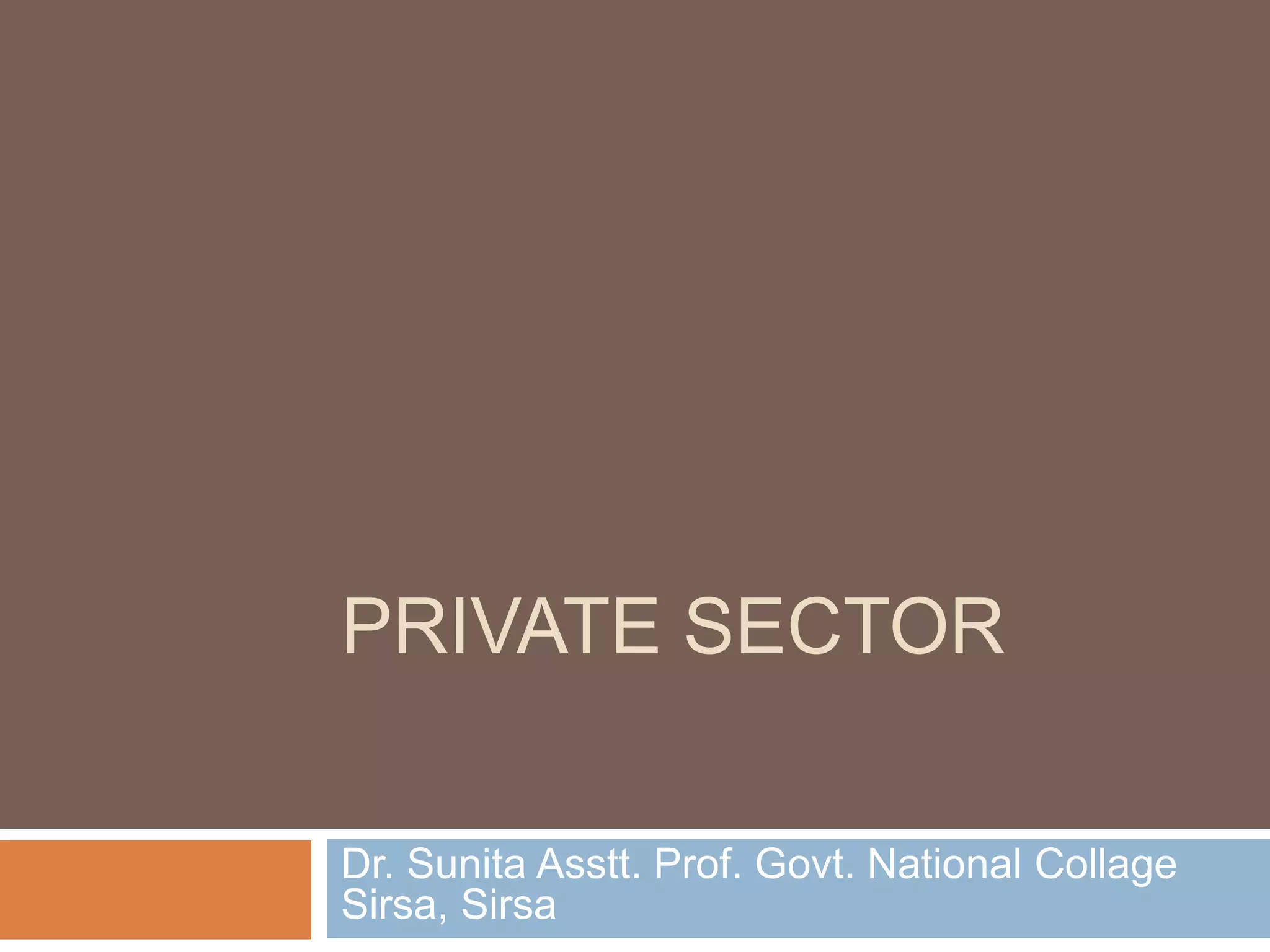 The private sector refers to parts of the economy that are run by private individuals or groups, rather than the state. It is characterized by private ownership and control, no state participation, private financing, and a profit motive. Major goals of the private sector include earning profits and quick decision making. Some limitations are that it provides no social welfare programs, guarantees, or protections against industrial disputes or risky situations. Examples of large private sector companies in India include Reliance Industries, Maruti, Infosys, and Tata Motors.