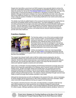 The document discusses several innovative private sector strategies that are providing affordable healthcare to low-income communities. It describes franchised healthcare networks in India and Africa that leverage partnerships and scale to reduce costs. It also outlines enterprises producing low-cost consumer products for disease prevention, such as cleaner cooking stoves, long-lasting insecticide-treated bed nets, and micronutrient-fortified foods and salts. The models demonstrate that private sector solutions using local resources and partnerships can successfully deliver essential healthcare and preventative services to those living at the base of the pyramid.