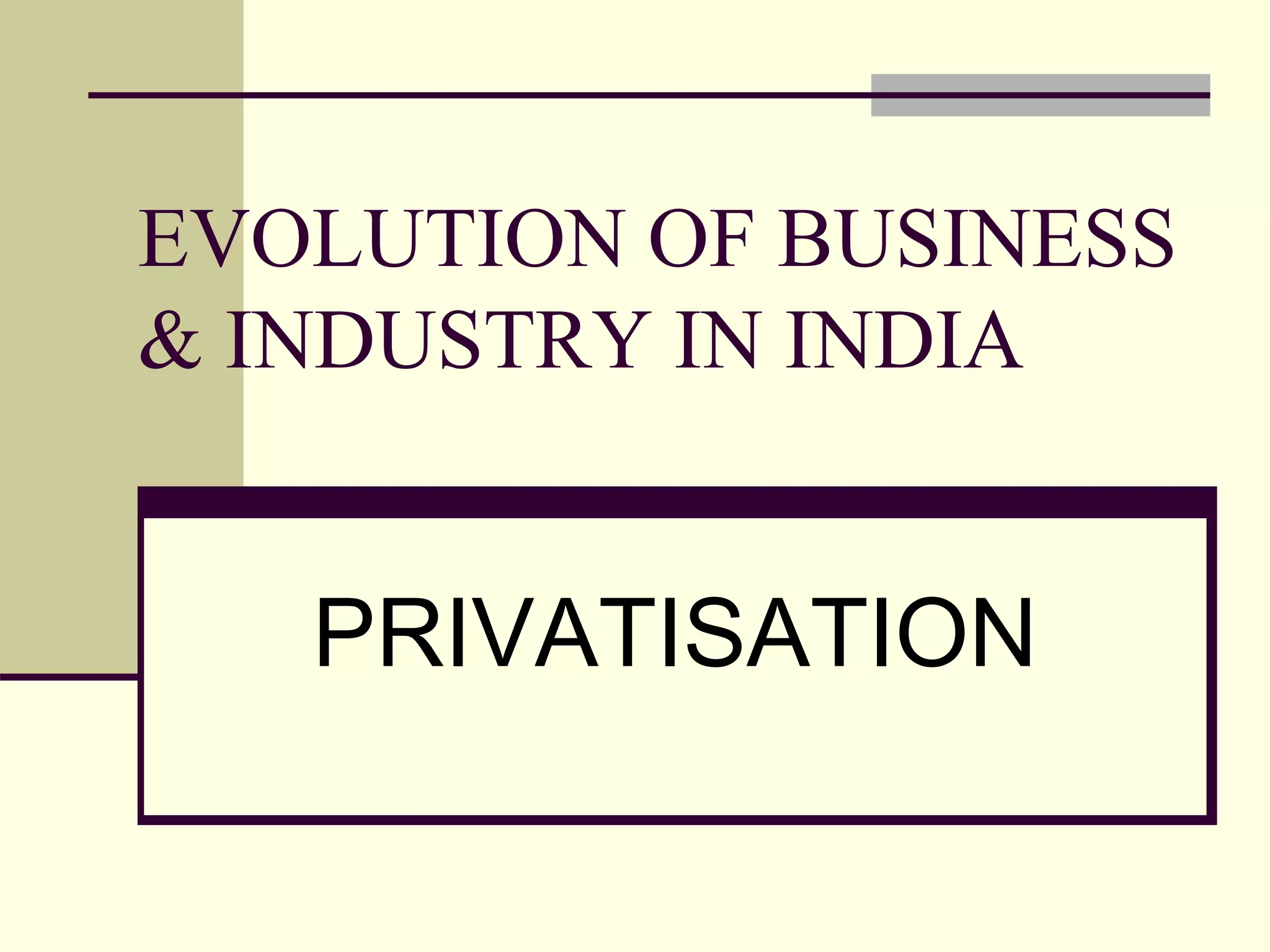 This document discusses the evolution of privatization in India. It defines privatization as the transfer of ownership or management from public to private sector. Privatization was introduced under Rajiv Gandhi but accelerated under P.V. Narasimha Rao and the new economic policy of 1991. The government uses strategic sales, joint ventures, and public share offerings to privatize public sector enterprises. Privatization aims to reduce the government's financial burden, increase competition and efficiency, but it may also lead to lack of social responsibility and loss of jobs. Examples provided include the privatization of LJMC and VSNL.