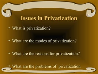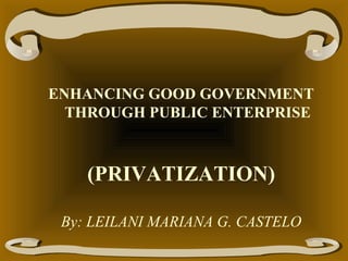 This document discusses privatization and its role in good government. It defines privatization as transferring public services to private sector control. There are several reasons for privatization, including rising costs for government and expertise of private companies. Privatization can occur through contracting out services, public-private partnerships, franchising, asset sales, and volunteerism. The government still maintains regulatory oversight when services are privatized. The goal of privatization is to improve efficiency while reducing government spending, though it faces issues like job losses and susceptibility to political pressure.