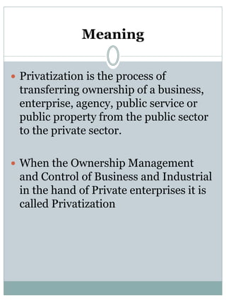 Privatization is the process of transferring ownership of public sector services and assets to private entities. It aims to reduce government involvement in commercial activities and increase efficiency through competition. Privatizing industries in India frees up resources, reduces the government's financial burden, and allows the private sector to contribute to economic development. However, some industries like atomic energy and railways remain under public sector control.
