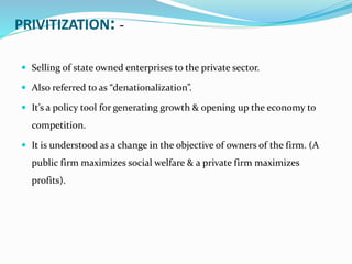- The advantages of privatization including increased efficiency and profitability, reduced political interference, retirement of debt, and reduced fiscal burden.