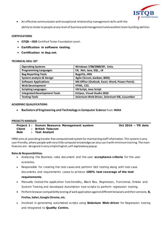 Priyanka is a dynamic professional with over 4 years of experience in both manual and automation testing for various applications, showcasing expertise in software testing methodologies and tools like Selenium and JIRA. She holds ISTQB certification and has actively contributed to projects in agile environments, demonstrating strong programming skills in languages like Java, SQL, and C#. Priyanka's portfolio includes significant roles in testing for notable clients such as British Telecom and AT&T, where she excelled in developing test cases, performing regressions, and participating in project management.