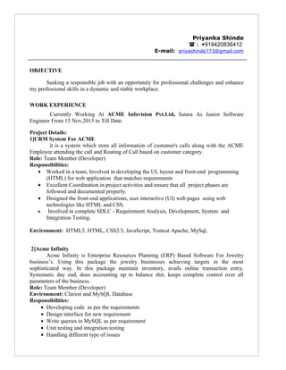 Priyanka Shinde is seeking a responsible job to enhance her professional skills. She has over 3 years of experience as a Junior Software Engineer developing CRM and ERP systems using technologies like HTML, CSS, JavaScript, MySQL, and Clarion. She has a Bachelor's degree in Computer Science and Engineering and completed training in PHP, Android, and ethical hacking. Her skills include programming languages like C, C++, PHP, and Java. She is innovative, creative, and able to work well under pressure to meet deadlines.