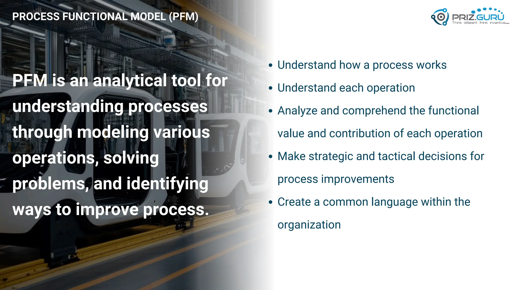 Discover how Process Functional Modelling (PFM) helps teams understand, analyze, and improve operational processes. This presentation from PRIZ Academy explores how to classify and evaluate each operation in a process, reduce complexity, and boost productivity using the PRIZ Engineering Thinking Platform. Ideal for QA leaders, engineers, and process improvement professionals.
