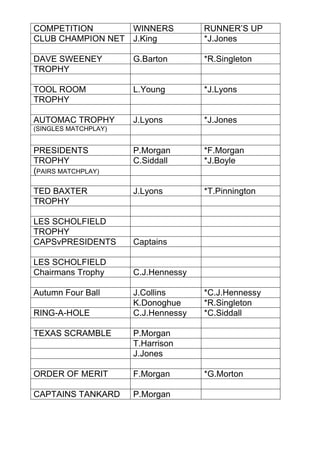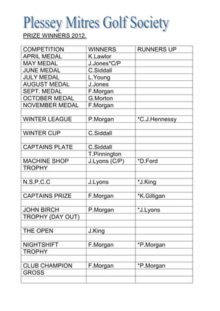 The document lists the winners and runners up of various golf competitions held in 2012. It includes monthly medal competitions from April to November, with various golfers winning individual months. It also lists winners of leagues, cups, trophies, and other competitions such as the Club Champion, Nightshift Trophy, and Captains Plate. The document recognizes the top performances of golfers in competitions throughout the year.