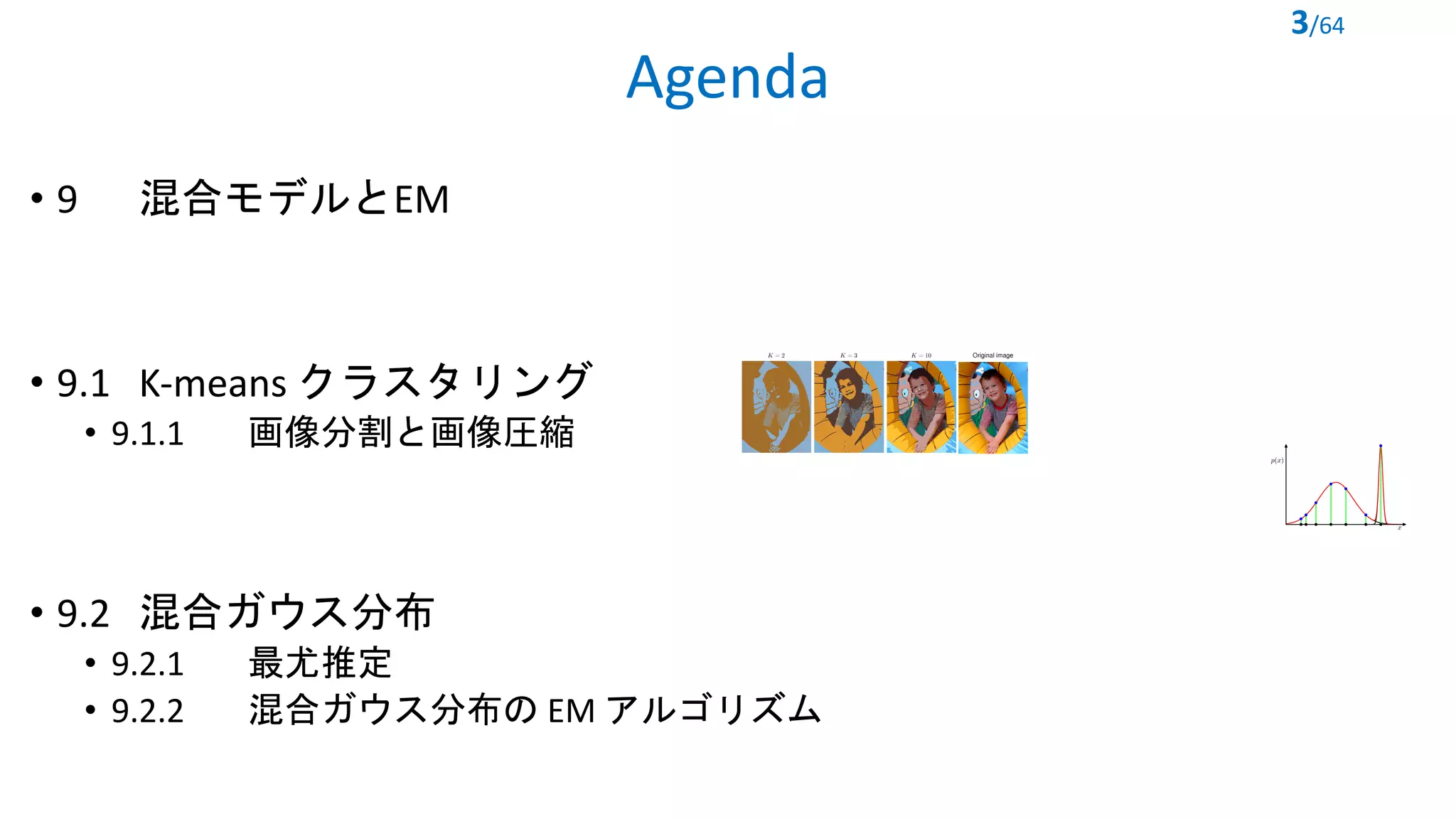 EM アルゴリズムを混合ガウス分布の最尤推定に適用 =>
