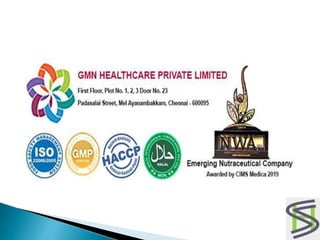 Dr. Sheela Sasikumar presents on nutraceuticals and GMN Healthcare's Pro360 product launch. She discusses how nutraceuticals can be used to modify health and focuses on using food as medicine for prevention. GMN provides various protein and nutrition supplements, including Pro360 Secret supplement which contains ayurvedic herbs and nutrients to support sexual health. Maintaining immunity is crucial during the COVID-19 pandemic and boosting it through nutritious foods is important.