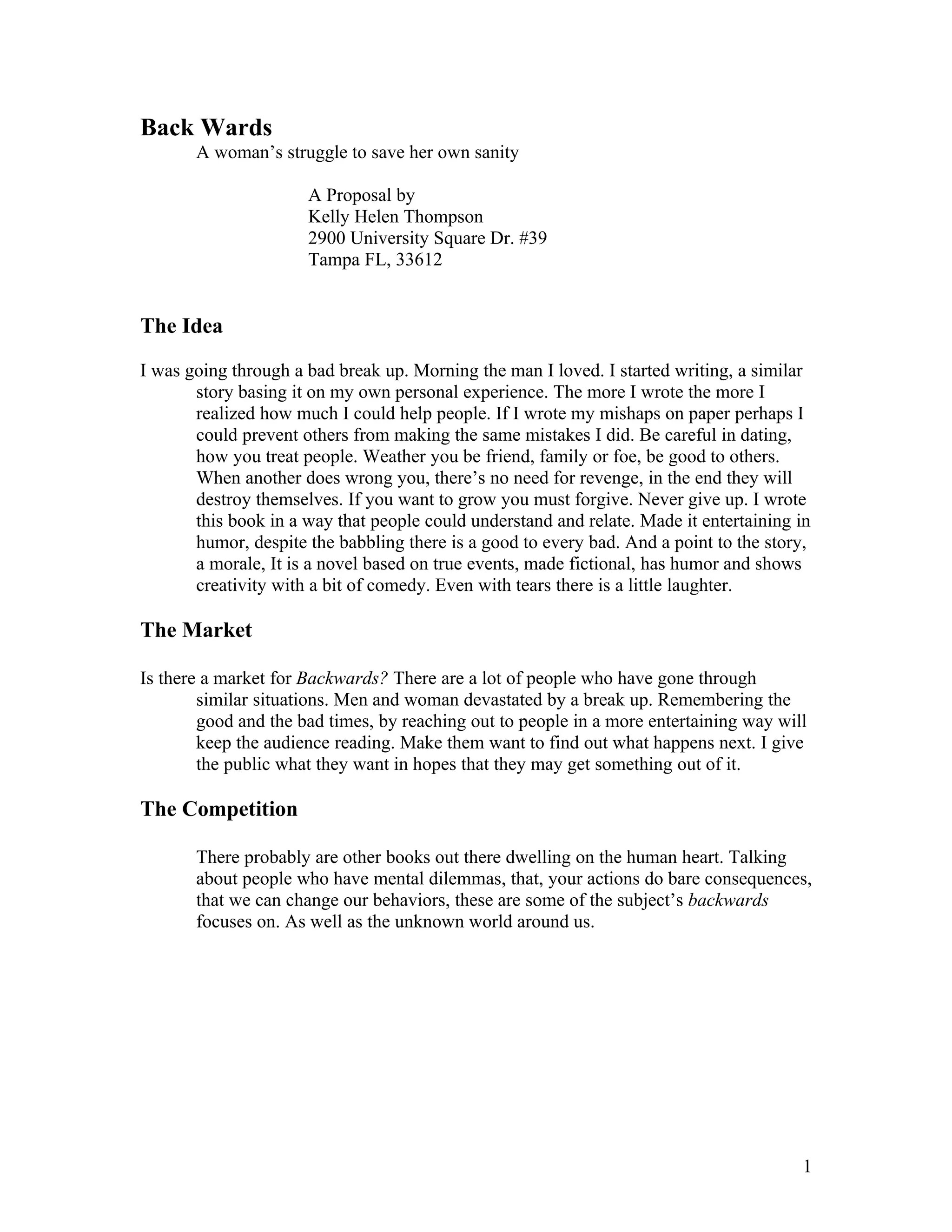 The document outlines Kelly Helen Thompson's proposal for her book, 'Backwards,' which draws on her personal experiences of a difficult breakup and aims to offer relatable insights and humor about love and relationships. It describes the various chapters, including themes of forgiveness, the struggle of long-distance relationships, and navigating dating difficulties, while emphasizing that the book is designed to entertain and provide moral lessons. Thompson also shares her background as a writer and her previous literary achievements, positioning 'Backwards' within a market of similar works addressing emotional challenges.