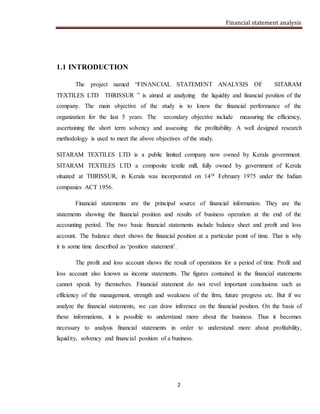 The document provides an introduction to financial statement analysis. It discusses that financial statement analysis involves reviewing a company's financial statements, including the income statement, balance sheet, and statement of cash flows, to assess performance. The document outlines the objectives and scope of analyzing the financial statements of Sitaram Textiles Ltd over a 5-year period from 2011-2015. It describes the sources of data, research methodology, limitations, and timeline of the study. Finally, it provides a literature review on financial statement analysis and what financial statements are.
