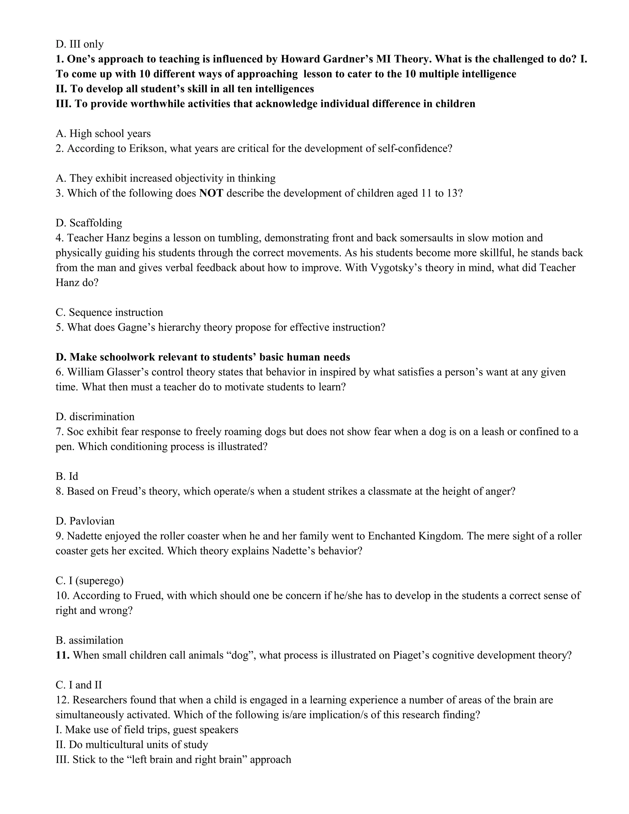 The document provides answers to multiple choice questions related to education theories, concepts, and principles. Some of the questions covered include Howard Gardner's theory of multiple intelligences, Erik Erikson's psychosocial stages of development, Jean Piaget's theory of cognitive development, B.F. Skinner's operant conditioning, and Albert Bandura's social learning theory.