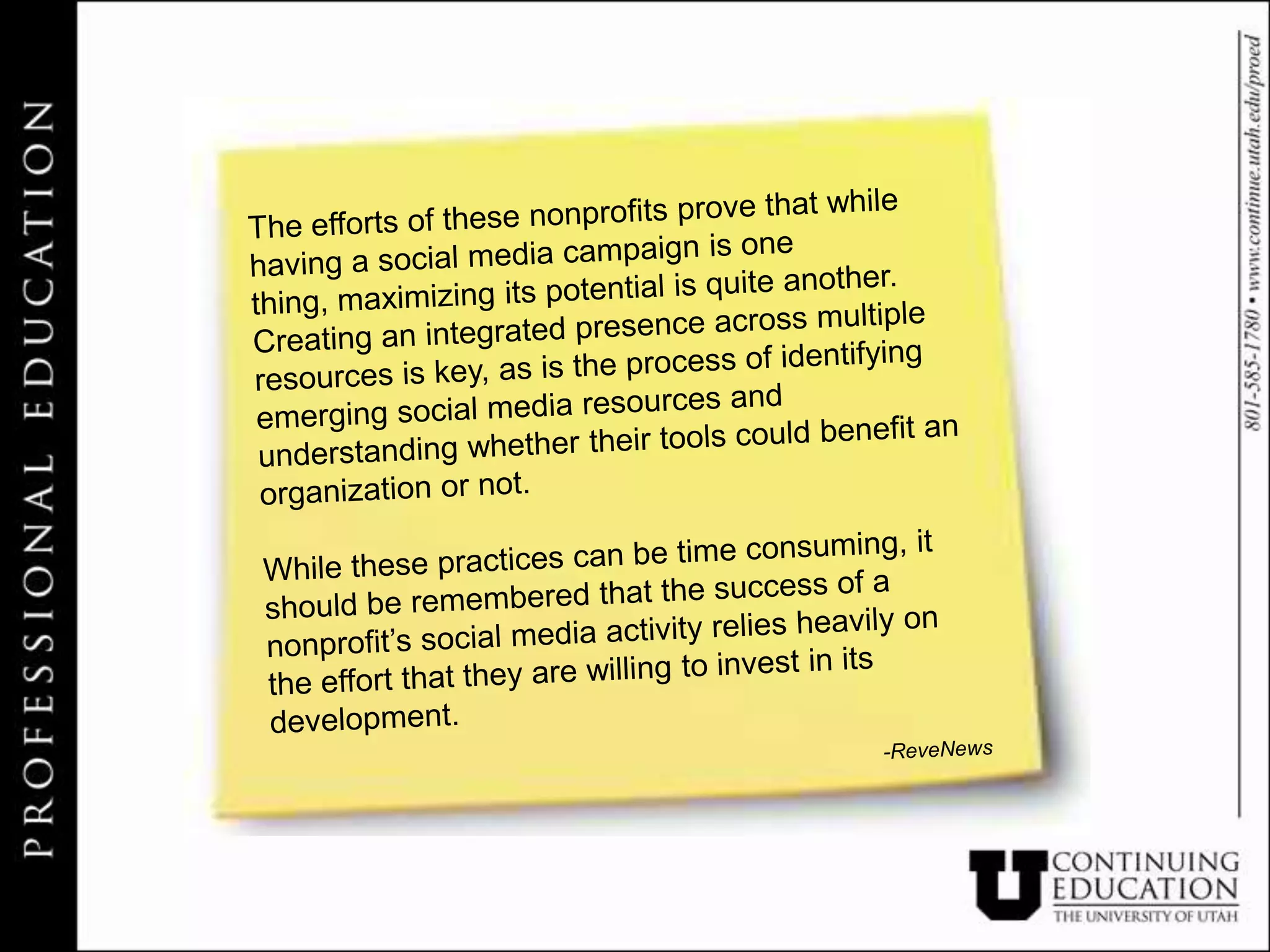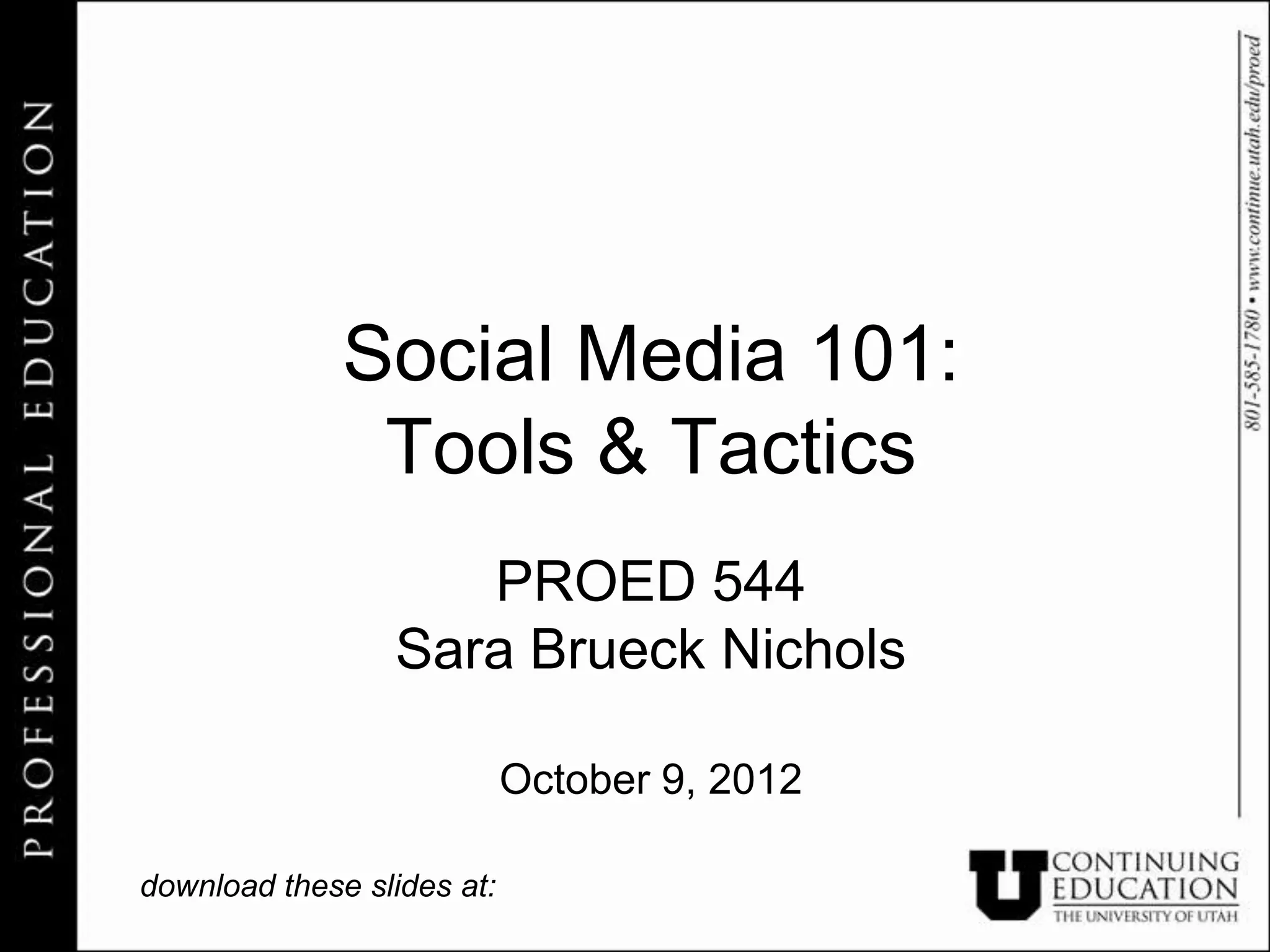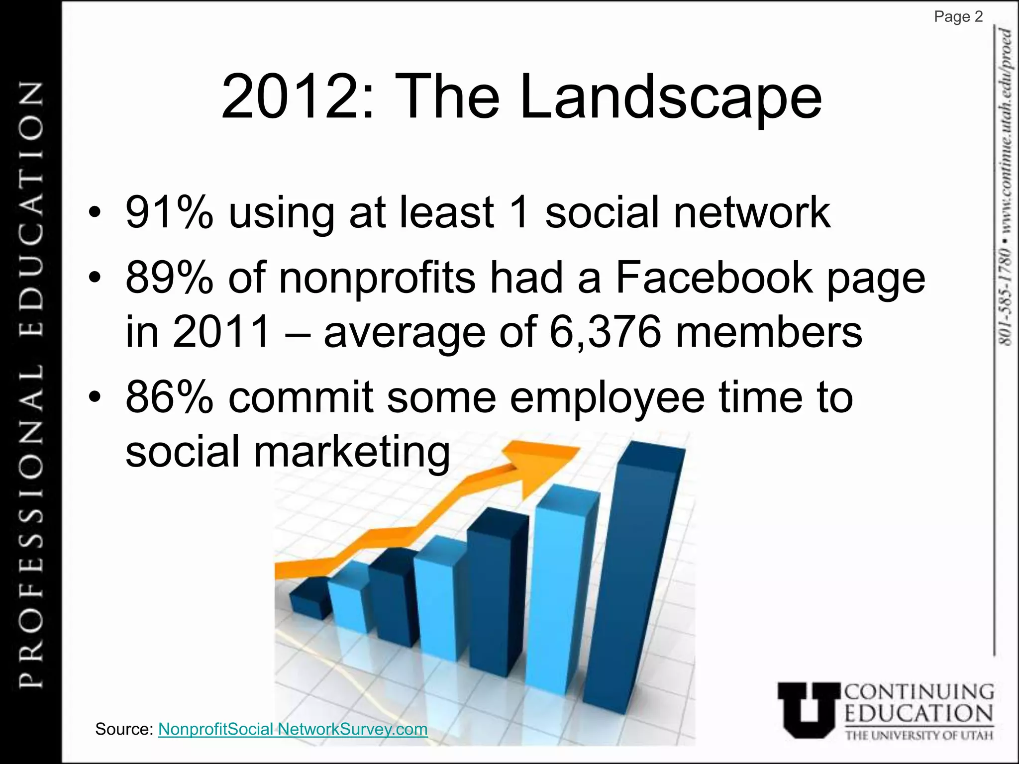 This document provides an overview of social media tools and tactics for nonprofits. It discusses the current social media landscape in 2012 and how 97% of nonprofits will keep or increase staff time dedicated to social marketing. The document then covers best practices for the major social media platforms including Facebook, Twitter, LinkedIn, Pinterest and Tumblr. It provides examples of how nonprofits and brands can effectively utilize different social media features and engage audiences. The goal is to help nonprofits integrate social media into their overall marketing strategy.