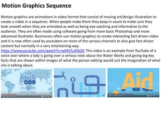This document discusses various motion graphics and visual effects techniques used in filmmaking. It provides examples of how motion graphics are used to create title sequences that set the tone for movies like Casino Royale and Vertigo. It also describes early visual effects techniques like matte paintings and travelling mattes that allowed filmmakers to create imaginary settings. Blue screen/green screen compositing is discussed as well as CGI techniques. Specific directors like Danny Fincher are highlighted for their innovative uses of visual effects that are often unnoticeable, like the unique flying camera effect created for the sex scene in Fight Club.