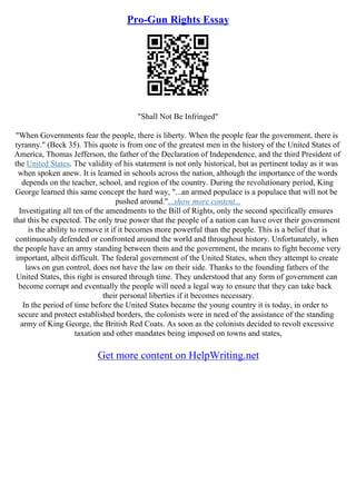 The document discusses the contentious issue of gun control in the USA, focusing on the right to gun ownership linked to self-defense and personal liberties as stipulated by the Second Amendment. It presents arguments from both pro-gun and anti-gun perspectives, addressing concerns about violence, crime, and the interpretation of constitutional rights. The paper ultimately emphasizes the belief that stricter gun control laws disproportionately affect law-abiding citizens, while also acknowledging the societal need for some limitations on weaponry.