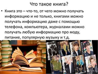 Документ обсуждает значение книги как источника информации и упоминает создание первой печатной машины Гутенбергом в XV веке, что стало толчком для быстрого развития книгопечатания в Европе. Также упоминается, что первый книжный магазин был основан армянином Тираном в Риме в I веке до нашей эры. В результате книгопечатания уменьшилась цена на книги, и библиотеки начали заполняться произведениями на различных языках.