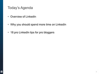 The document presents LinkedIn tips specifically for bloggers, shared by Connie Chan Wang at BlogHer Pro 2013. It details the importance of LinkedIn as a professional network and offers 18 actionable tips to enhance blogger profiles, including optimizing profiles, sharing rich media, and utilizing networking features. Emphasizing LinkedIn's role in establishing expertise and connecting with decision-makers, the document encourages bloggers to actively engage on the platform.