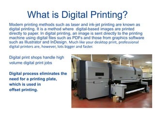 Digital and offset printing are the two main types of professional printing. Digital printing prints directly from digital files onto paper without plates, while offset printing uses plates to transfer ink from a plate to a rubber blanket to paper. Offset is best for larger print runs due to lower per-unit costs, while digital is faster with on-demand printing and customization. The offset printing process involves pre-press work to create plates from digital files, running the plates through a printing press, and finishing steps like trimming, folding and binding. Proper file preparation for offset includes using CMYK color, high resolution images, correct bleed and trim settings.