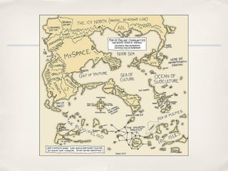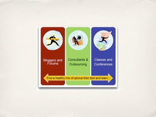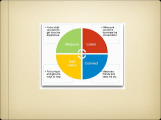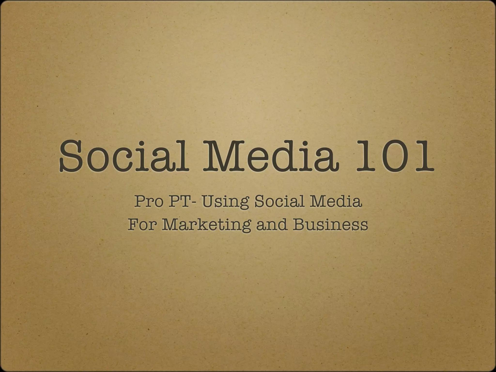 This document provides an overview of social media and its uses for marketing and business. It discusses popular social media tools like Facebook, Twitter, blogs, podcasts and videos and how they can be used to engage customers, build communities, and gain a competitive advantage. It emphasizes that social media is about building relationships and relevance over time, not just tactics, and recommends developing a strategy to measure success based on goals like sales, engagement, retention or influence. It also cautions that social media requires a long-term time commitment to see benefits and balancing participation with other work.