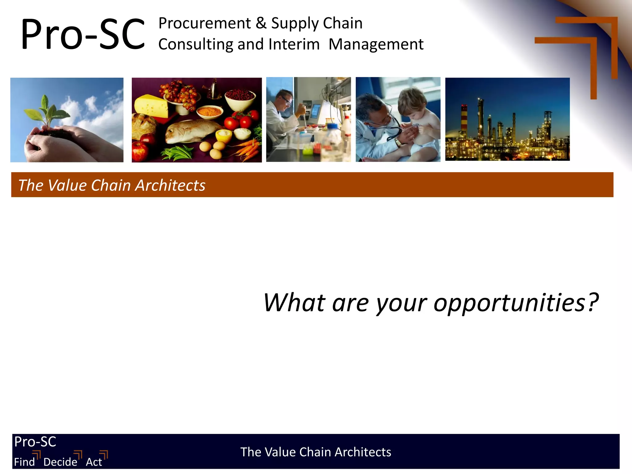 Pro-SC provides procurement and supply chain consulting and interim management services. They help clients optimize their supply chain to realize business growth through opportunities in the value chain. Key services include identifying opportunities, prioritizing actions, and executing plans hands-on with clients. Pro-SC takes an integrated supply chain approach to deliver benefits like reduced costs, improved service levels, and increased revenues. They offer a unique entrepreneurial style and proven methodologies developed from experience in industries like agri-food, life sciences, and asset-intensive sectors.